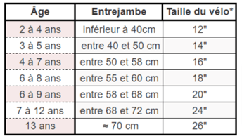 A titre indicatif utiliser le tableau pour définir la taille du vélo approprié.